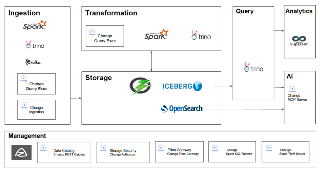 Chango provides popular open source engines like Spark, Trino, Kafka, and Iceberg as lakehouse table format, and Chango specific components.